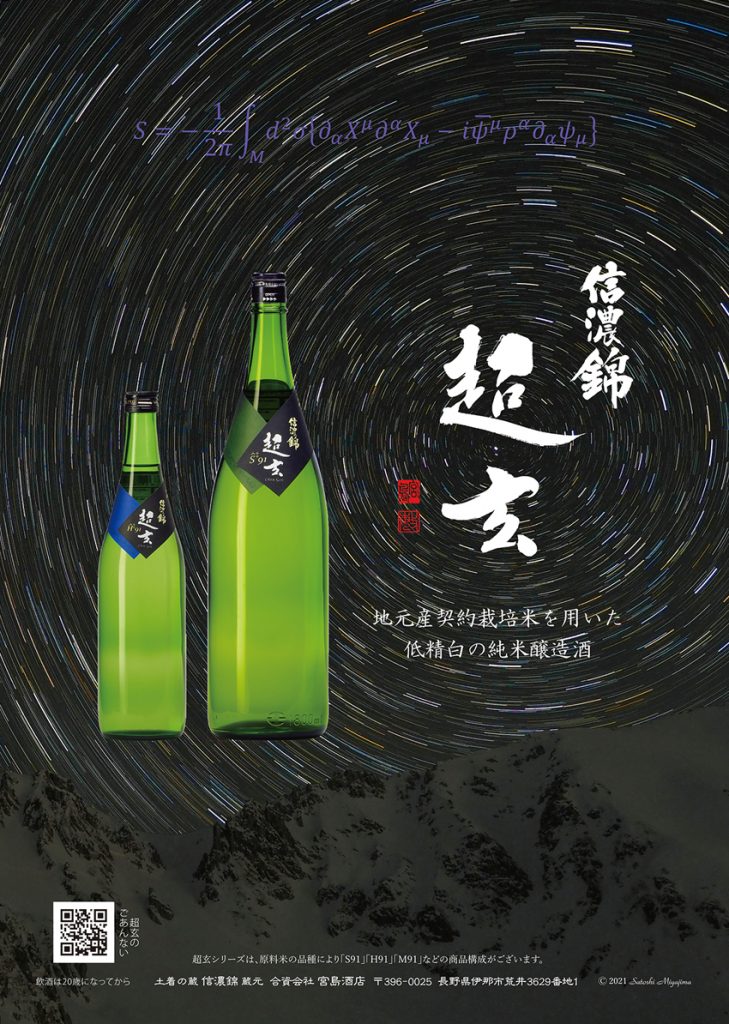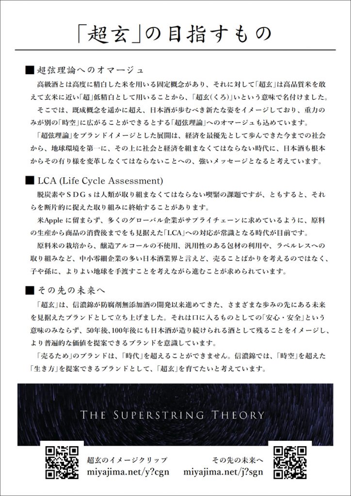 「超玄」のブランドコンセプトは、この宇宙の成り立ちを記述しようとする「超弦理論」へのオマージュです。県外産酒米「山田錦」への信仰や、「高品質=高精白」という価値観、或いは醸造アルコールを加えて香りを最大限に引き出した大吟醸を高く評価するという時代が長く続いた中で、信濃錦が平成16年以来積み重ねてきた「地元産契約栽培米を用いた低精白の純米醸造酒」という考え方は異端と見られてきましたが、温暖化や食糧危機を目前とした現在、地域循環経済としての地元へのこだわりや、農薬の使用を抑制した農法の大切さ、低精白米を用い醸造アルコールを用いないことで、フードロスやエネルギー消費を抑制できることなどの意味合いをご理解いただけるようになってきました。既存の価値観から全く別の価値観へ社会を変革させなくてはならない「SX」の時代を迎え、あたかも超弦理論の中で重力を伝達する重力子のみが別の宇宙に飛び出していくことができる姿にも似て、新たな日本酒の姿を体現した製品群にふさわしいブランドであると考えています。
