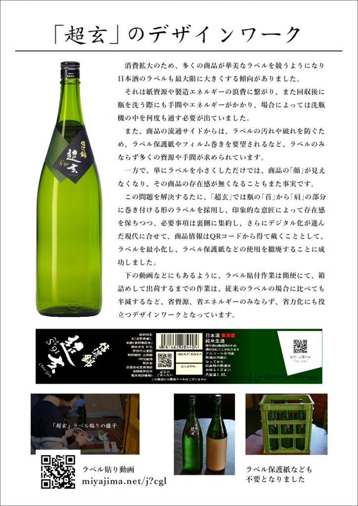 発売当初より超弦理論の方程式をラベルに刷り込むなど、そのブランドコンセプトの提案を意識してまいりましたが、この冬より発売する新酒からは、瓶の首に巻きつけるのみの新たなラベルデザインを採用し、省資源化を推進する形で商品コンセプトに沿ったラベルとしています。これにより、単にラベル紙の使用量削減のみならず、ラベルの汚れ対策として用いてきたラベル保護フィルムなどの副資材の削減も可能となります。