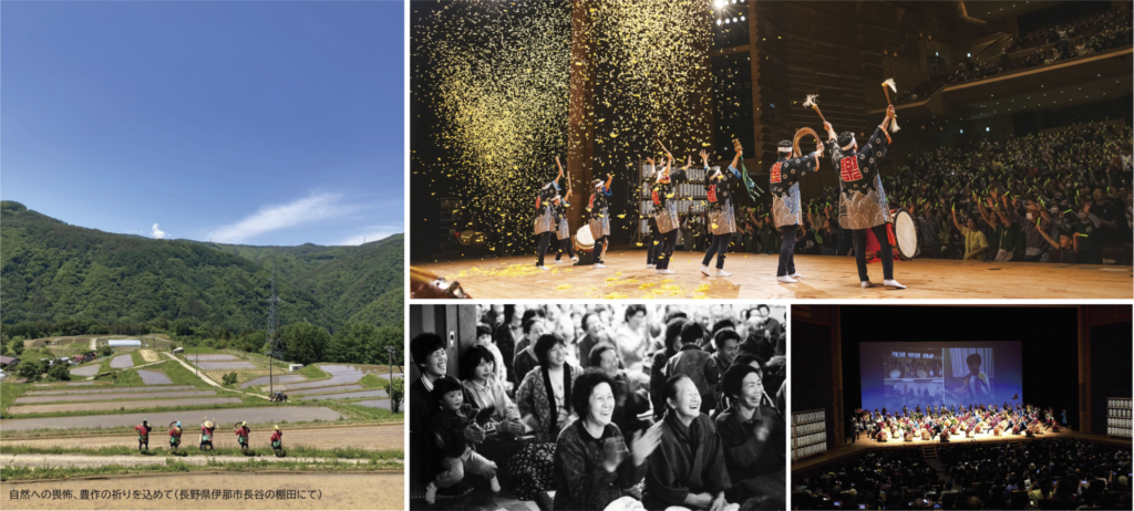 個性豊かで力強く、安心感と安定感が伝わるよう工夫を重ねています。舞台では、芸能が持つ独特の雰囲気や間、リズムの訛りといった【技】、他者と共に暮らし力を結束するための【知恵】、そして演者の自己表現にとどまらず、自然への畏怖や尊重、豊作への祈り、人への思いやりなど、先人たちが大切にしてきた【想い】を表現しています。